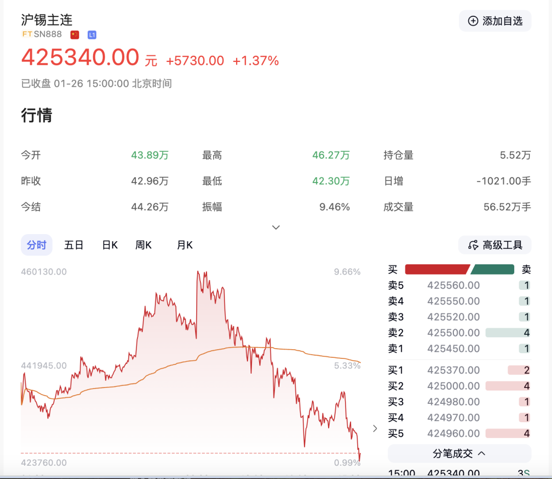 1月26日,沪锡期货主力合约一度涨超10%,报约46.27万元/吨。截至当天收盘,报42.53万元/吨,较前一交易日上涨1.37%,月内涨幅超25%。